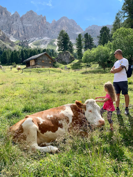 Mia era molto interessata a scoprire le curiosità di flora e fauna del bosco. Così senza nemmeno accorgersene ha camminato molto volentieri tutto il tempo. Una volta arrivati al Rifugio Gardeccia, oltrepassato il ponte in legno sotto l’edificio e seguito l’indicazione del Sentiero delle Leggende. In 10 minuti siamo arrivati a Malga Couler.