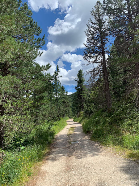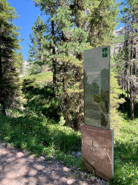 Dopo una breve pausa abbiamo imboccato il sentiero della foresta (nr. 540) a sinistra della funivia, seguendo le indicazioni per il Rifugio Gardeccia. Una semplice camminata pianeggiante di circa 1 ora (con i bambini), fattibile anche con il passeggino da trekking. Il percorso è accompagnato da 24 totem informativi dedicati alla natura di alta montagna.