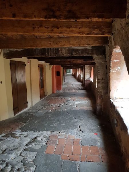 Tra le stradine del borgo la più caratteristica è sicuramente l’antica via del borgo, nota anche come Via degli Asini. È una strada sopraelevata, caratterizzata da un porticato con tante casette colorate. Un tempo era un camminamento di ronda e rappresenta infatti il più antico baluardo della città. Poi divenne un’importante via di comunicazione e passaggio e qui vivevano coloro che trasportavano il gesso, con carri trainati da asini, da qui il nome.