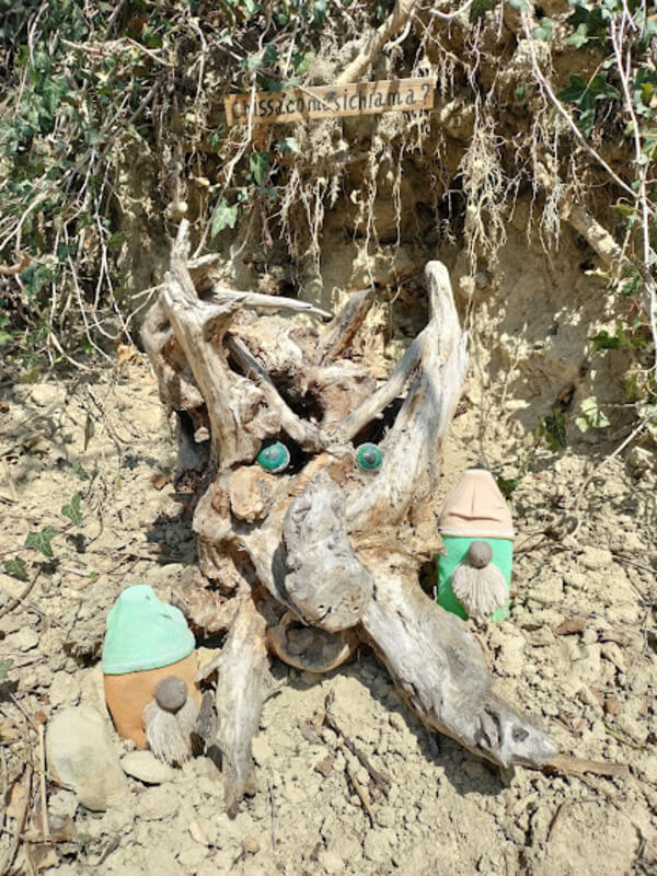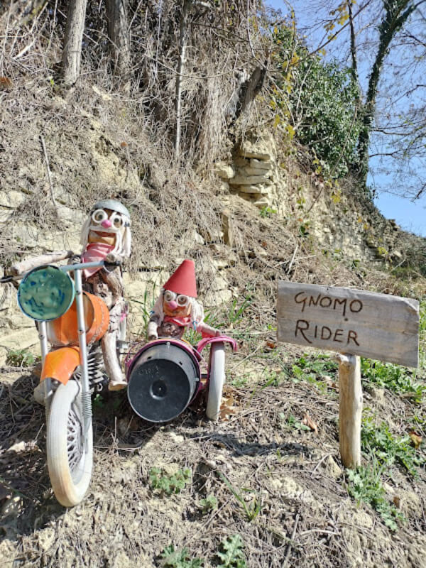 Il valore aggiunto della Gnomovia sta proprio in questo, nell’entusiasmo di chi lo ha realizzato e nella voglia di arricchirlo giornalmente. Marzia ci ha raccontato che l’ispirazione è arrivata dai suoi nipoti: quando erano piccoli e li portava su questa strada tra i filari raccontava loro storie che nel tempo sono diventate un quaderno di racconti sugli gnomi e altre creature magiche, benevole, simpatiche che vivono in questi luoghi.