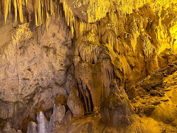 La nostra guida si chiama Luigi e ci racconta subito che “l’iscrizione 1666 data probabilmente la prima visita in grotta”, mentre la prima visita documentata risale al 1704 e “a fine ottocento le grotte diventano percorso turistico e per arrivare alle grotte si usavano le slitte”, per poi diventare un rifugio per la popolazione di Taranta Peligna, vicina alla linea Gustav. durante la Seconda guerra mondiale.
