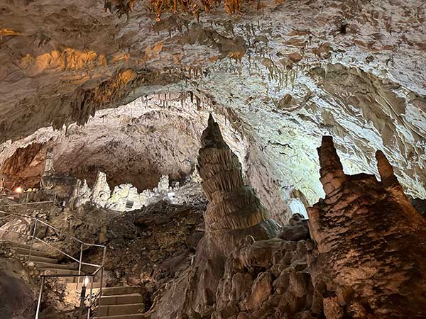 La passeggiata dall’arrivo della cestovia all’ingresso delle grotte, andando piano, richiede 10-15 minuti e le visite guidate partono ogni ora; perciò, se avete bambini piccoli, o non amate le scale, avviatevi con calma, non vi corre dietro nessuno e calcolate anche 20-25 minuti.