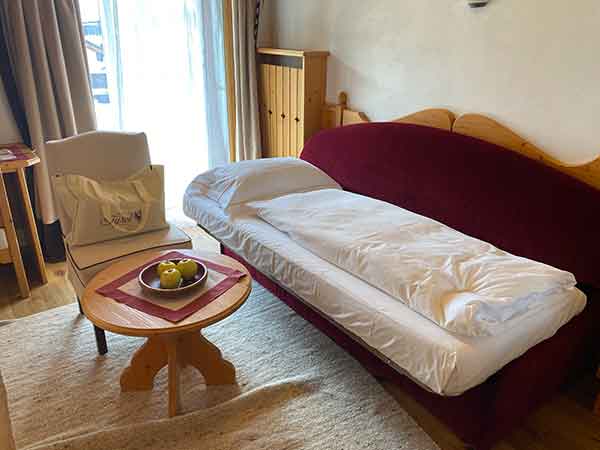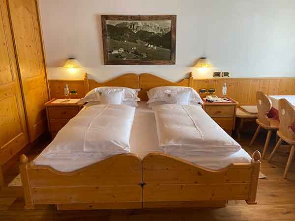Le camere come un po’ in tutto l’hotel riescono a fondere i preziosi dettagli della tradizione ladina con i servizi e i comfort moderni. Oltrepassata la porta in legno dipinto ti trovi in un caldo nido accogliente, con la stube, gli arredi caldi in legno, i cuscini ricamati, un cesto colmo di mele croccanti e un biglietto di Benvenuto scritto a mano da Maurizio e Bibiana, piccolo dettaglio, ma che ti fa sentire “accolto”.