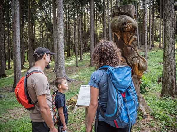 Dal paese di Preghena, in Val di Non, parte con un percorso ad anello facile e adatto anche ai bambini più, il Sentiero dei piccoli, il sentiero “il lavoro, le fate, le streghe, anche se tutti lo chiamano semplicemente “il sentiero delle fate”. Lungo la strada si incontrano 21 sculture di legno e ogni scultura, racconta una fiaba e una leggenda o anche più leggende insieme del territorio. Un’esperienza da fare assolutamente e un cammino che può essere percorso anche con i passeggini da trekking o il marsupio. E a metà percorso c’è anche la possibilità di sostare in un’area attrezzata per i picnic. Mentre cammini cerca per terra le tracci dei “Peste del Diol”, diavoletto con tanto di forcone, le cui impronte sulla pietra raccontano della sua battaglia per dominare il mondo.
