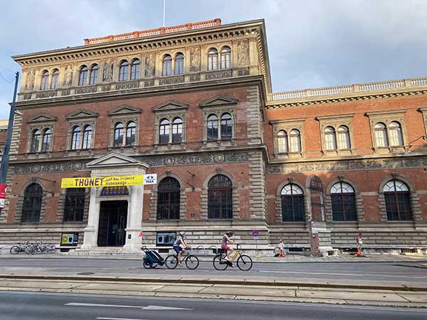 Il tram gira leggermente a destra, e dopo poco, sulla sinistra, si vede la Borsa di Vienna.