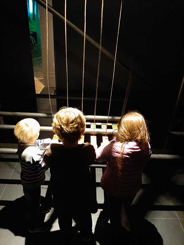 Si è partiti dalla sala dedicata al Novecento con documenti fotografici di vita quotidiana, per poi passare alla sala Caccia con ocarine e fischietti originali donati dalle famiglie del posto costruiti con i materiali più disparati, fino ad arrivare alla sala Campane dove abbiamo incontrato un incredibile organo interattivo costruito con tubi metallici per impalcature, per poi finire nella sala Musicanti con una proiezione a sorpresa coinvolgente quanto una vera festa di paese. Ciò che però più ha entusiasmato i bambini è stata la riproduzione di un bosco, in penombra e un po’ magico, nel quale sono stati invitati a entrare e a cercare di riconoscere le sagome di uccellini e i loro versi registrati.