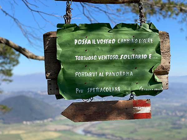 Proseguendo con il fiume sulla destra la passeggiata conduce fino all’estremità di monte Castellone-Gagliola. A metà strada ci siamo fermati dove abbiamo trovato un altro cartello, appeso a un albero con due frasi, anche questa volta un po’ sgrammaticate, ma ispirazionali: