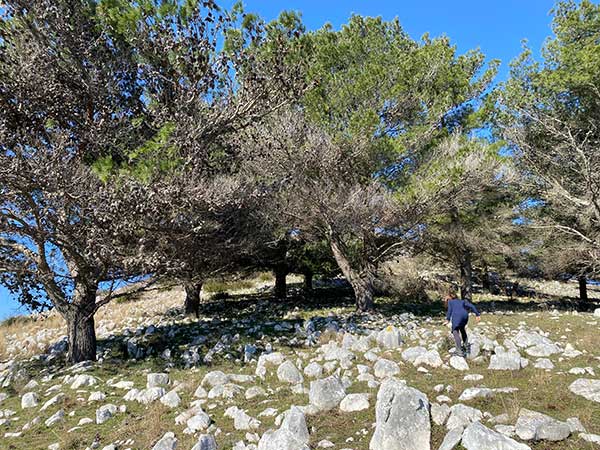 Il cammino è dolce e solo in lieve salita, ma l’aspetto più piacevole è che oltre i cespugli di mirto, le colline sono ricche di piante di fichi, pimpinella, erica, timo, zafferano selvatico.