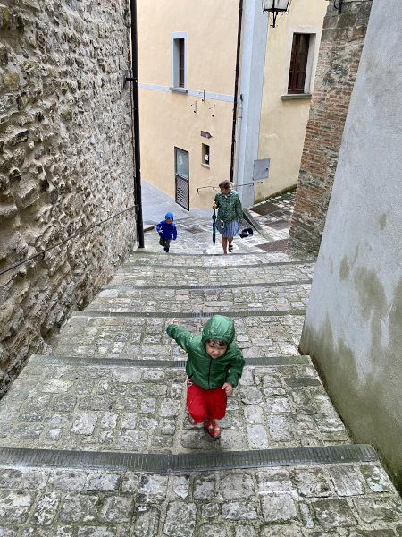 Ci siamo inerpicati per le sue strette viuzze, sempre accompagnati da una leggere pioggia.