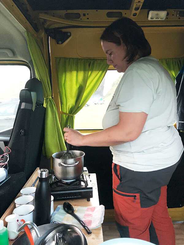 Abbiamo noleggiato un van Happy 3 (Renault Master) con cinque posti auto e letto. Il retro del van, a cui si può accedere da entrambi i lati con le porte scorrevoli, è molto spazioso (grazie all’assenza del bagno). La zona cucina è collocata dietro al posto guida e passeggero ed è composta da un mobile in legno con un frigo, un lavello, un fornello a gas portatile (utilizzabile anche fuori), un piano di lavoro e cinque cassettoni. Con il fornello a gas la nostra compagnia ci ha fornito 4 ricariche che sono state sufficienti per tutto il viaggio. Le stoviglie incluse nel nostro caso erano: una pentola non grandissima, una padella, cinque piatti piani e cinque ciotole, cinque bicchieri e le posate.