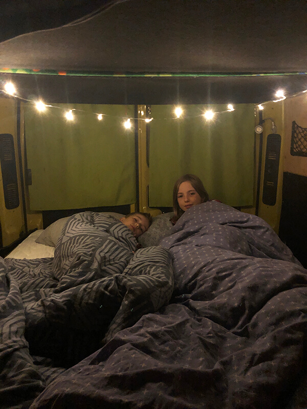 Happy Campers fornisce le lenzuola, i cuscini e due piumini leggeri. Il van è dotato di un sistema di riscaldamento alimentato dalla una batteria elettrica che si ricarica durante gli spostamenti e con un pannello fotovoltaico sul tetto.