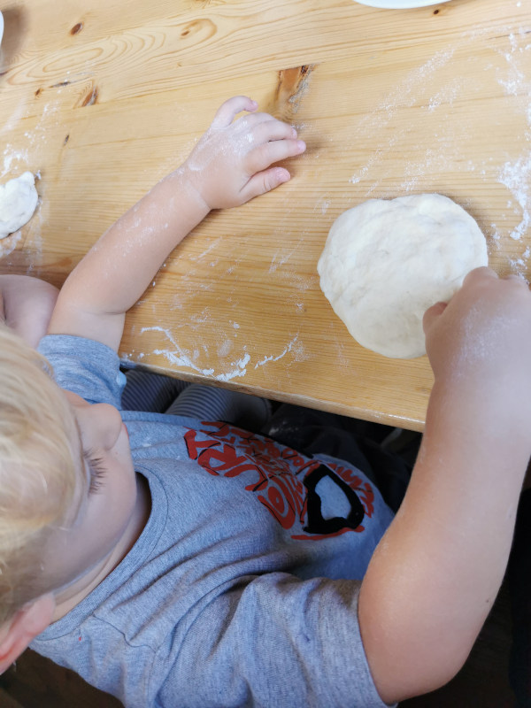 La domenica in cui siamo andati noi, i bimbi (e anche noi, perché eravamo pochi) hanno preparato ognuno la propria schiacciata, stendendola con le manine e condendola con l’olio prodotto con le olive della fattoria e il rosmarino. Poi abbiamo aspettato che fossero cotte e le abbiamo mangiate tutti insieme!