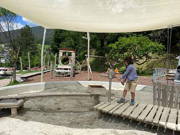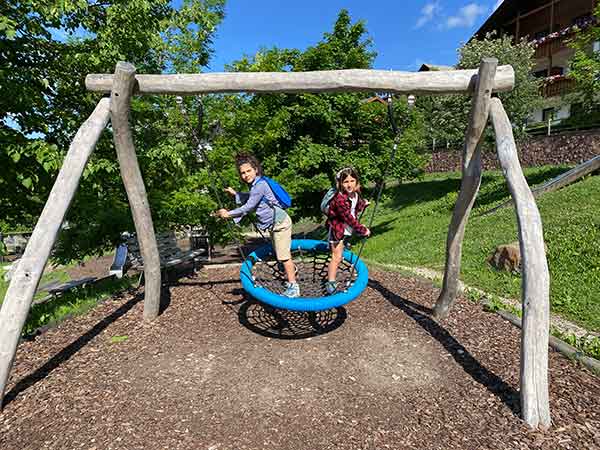 Ma la vera attrazione per i bambini lungo questo sentiero che porta da Selva a Ortisei sono i parchi gioco. Noi ne abbiamo contati sette. Tutti con giochi in legno, altalene, scivoli a tubo, percorsi di equilibrio, sabbiere…e si finisce con il parco più bello, il parco del trenino a Ortisei.
