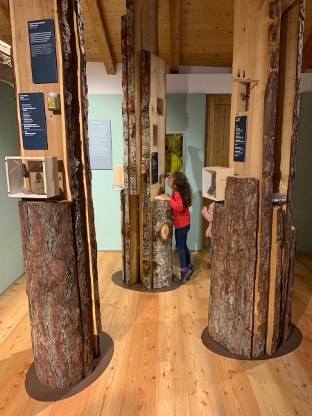 Una grandissima stanza suddivisa da pannelli esplicativi che ricreano i vari ambienti del bosco. Inoltre ci sono esposti vecchi attrezzi utilizzati sia per coltivare la terra che per la lavorazione del latte. Sicuramente la sezione più bella è quella centrale viene riprodotto un video della vallata dall’alba al tramonto. Il nostro consiglio è quello di sedersi per terra, di osservare e ascoltare i suoni del corto. Terminata la riproduzione abbiamo cominciato ad esplorare la stanza abitata da animali imbalsamati e da diversi tronchi d’albero. La cosa che più è piaciuta alle bimbe è stata la possibilità di annusare il profumo degli alberi.