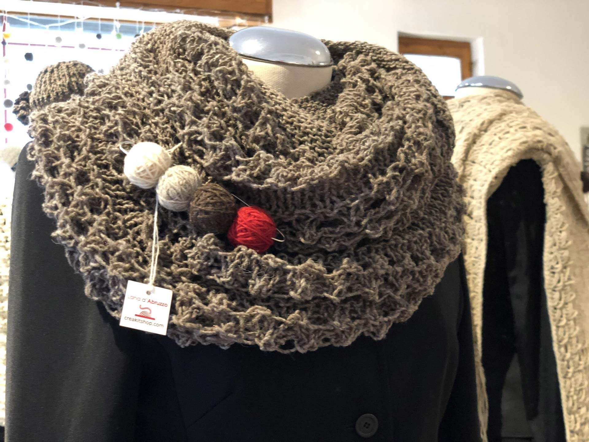 Lana chilometro zeroMentre i bambini e Francesco sono ancora al bar, io attratta dai negozietti vado a fare una passeggiata e vengo attratta come da una calamita dal negozio Lana d’Abruzzo. Spio dalle vetrine e vedo scialli, vestiti, spille, cappelli, pupazzi, ghirlande di pon-pon: tutti lavorati a mano, prevalentemente con colori naturali, ottenuti dalla miscela di lana di diversi allevamenti. Entro. Difficile spiegare la sensazione, ma è come entrare in una casa, in una bella casa, dove ci sono le coperte fatte a mano, un vaso pieno di bottoni giganti, la sedia ricoperta di pupazzi.