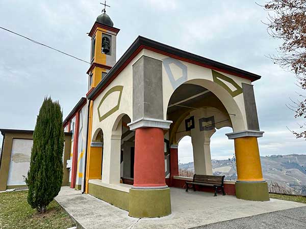 La Chiesetta della Beata Maria Vergine del Carmine è stata dipinta dall’artista britannico David Tremlett, che ha scelto una palette di tre colori ben riconoscibili: terra di Siena per il corpo dell’edificio, giallo per l’atrio porticato e verde oliva per il basamento e la sacrestia.