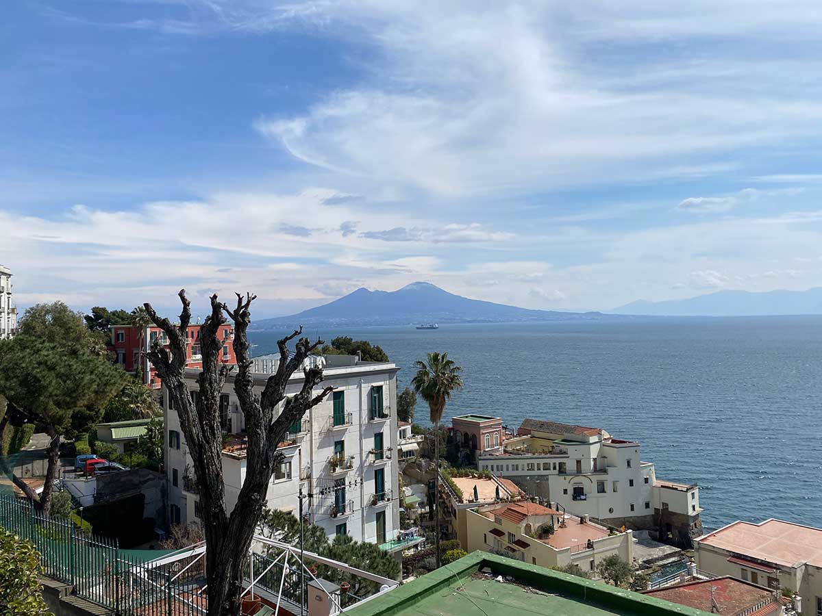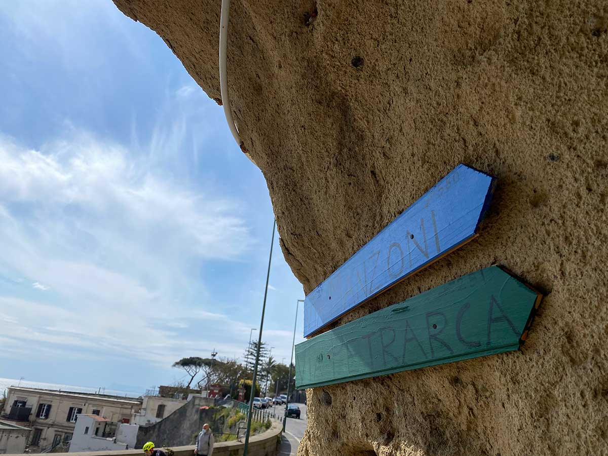 Si prosegue verso sinistra e si continua a scendere. Una passeggiata di 20 minuti e sotto un arco di tufo giallo ecco il mare: si arriva a via Posillipo e l’orizzonte si allarga e si sbuca su via Posillipo, con il Vesuvio che ti accoglie e sembra salutarti.