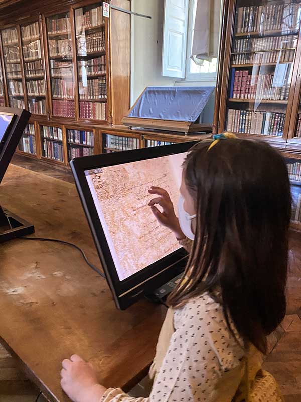 Ci sono tre monitor per vedere i capolavori nel dettaglio e anche per spiegarli con più facilità ai bambini. Vi consigliamo di cercare la fiaba delle Farfalle e la lampada, fiaba sulla caducità della vita, per attrarre l’attenzione dei più piccoli e mostrare ai bimbi i disegni di Leonardo da Vinci e anche il suo insolito modo di scrivere. Lo sapete che scriveva da destra verso sinistra?