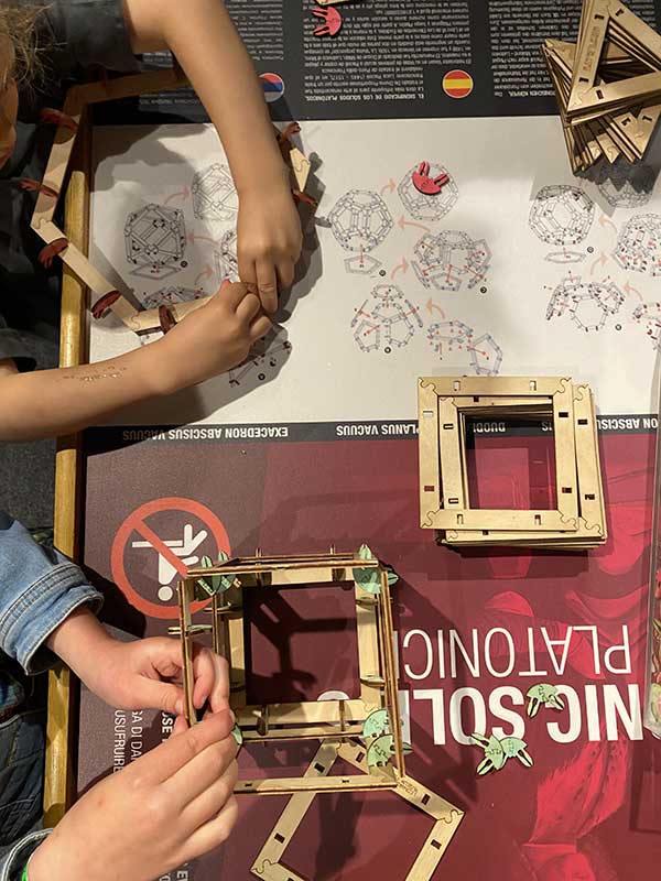 Un’area che ci è piaciuta molto è stata quella dei laboratori liberi. Grandi tavoli in cui puoi provare a costruire da solo un Ponte o una delle invenzioni più affascinanti di Leonardo, la Cupola Autoportante, una cupola che si mantiene unita grazie al suo peso ed all’azione della forza di gravità: intrecciando appositi bastoni in legno della stessa dimensione dotati di apposite “tacche”, potrai costruirla con le tue mani ed apprezzarne le sue caratteristiche modulari e di resistenza meccanica, tali da renderla idonea anche alla copertura di spazi di grandi dimensioni