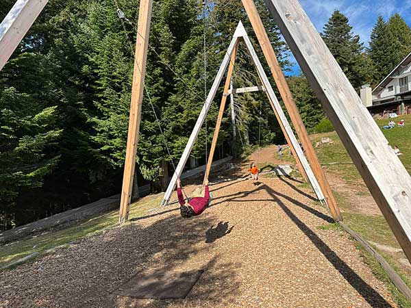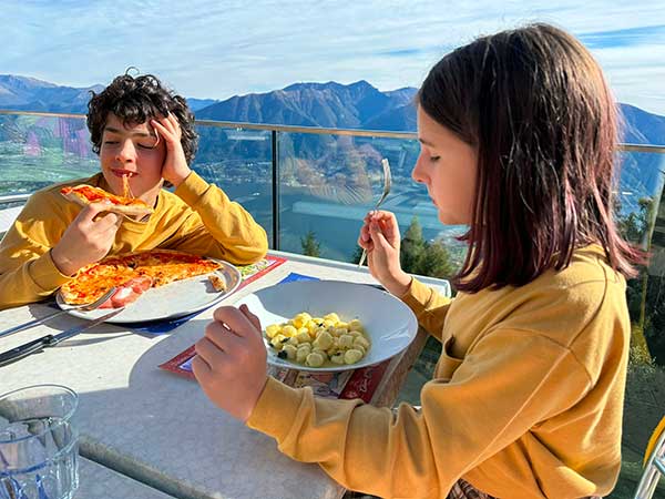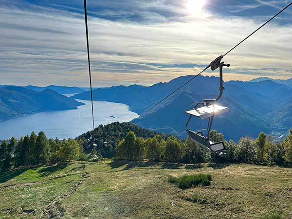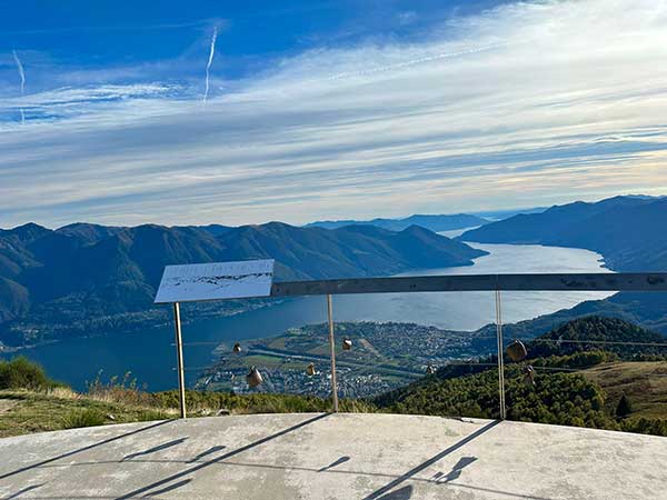Pensavamo di esserci già riempiti gli occhi di bellezza e invece, arrivi a Cimetta, ecco un panorama mozzafiato sul lago e sulle Alpi e l’osservatorio geologico: una piattaforma corredata di pannelli e materiali spiegano l’origine geologica delle montagne circostanti, in particolare la storia geologica delle Alpi svizzere. Ma la nostra attrazione preferita è stata l’altalena panoramica. Bisogna provarla. Non possiamo descrivere l’emozione di dondolare sospesi tra il lago e il cielo.