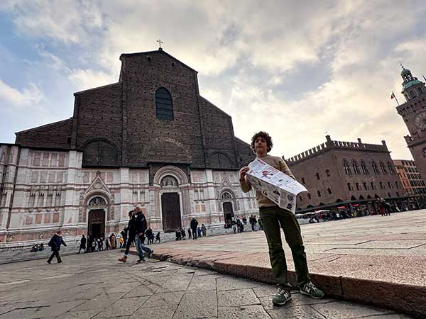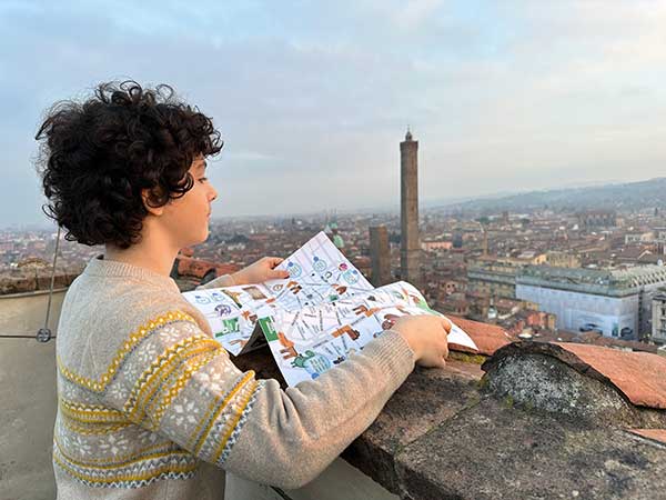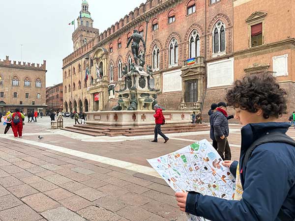 Nella mappa di Bologna per bambini diamo tanti consigli, ma soprattutto c’è una caccia al tesoro, con dieci posti da scoprire e fotografare e/o disegnare per ricevere via mail il diploma del Vero esploratore.