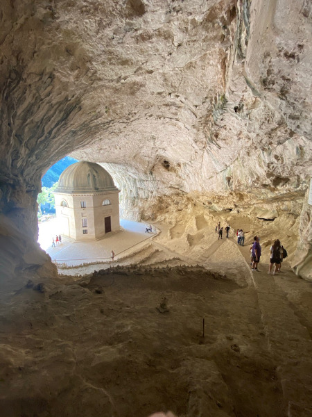 Dopo aver visto casualmente alcune foto online, presi dalla curiosità e dalla bellezza, ci siamo fermati con il nostro bisonte un paio di chilometri dopo il centro storico medievale di Genga (AN). Abbiamo lasciato il camper lungo il ciglio stradale, come fanno un po’ tutti i visitatori, anche se in realtà all’inizio del sentiero che porta al santuario c’è un piccolo parcheggio (di difficile accesso con mezzi ingombranti come il nostro).