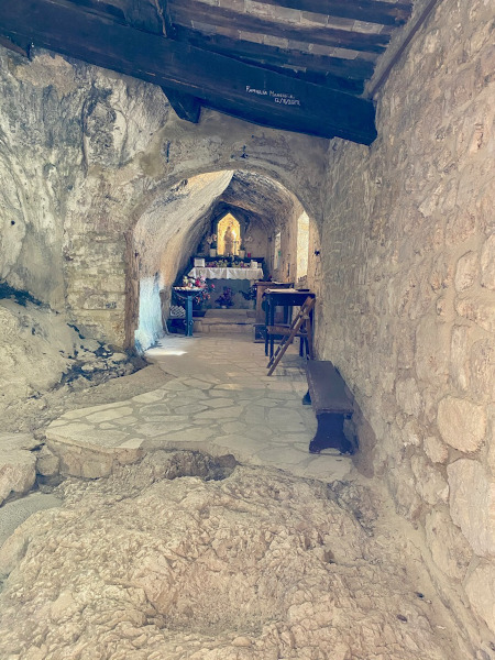 E’ caratterizzato da un’architettura semplice, in pietra il cui interno è in parte scavato nella viva roccia. Le sue piccole dimensioni lo rendono un gioiello incastonato tra le pareti della grotta.