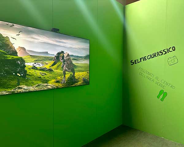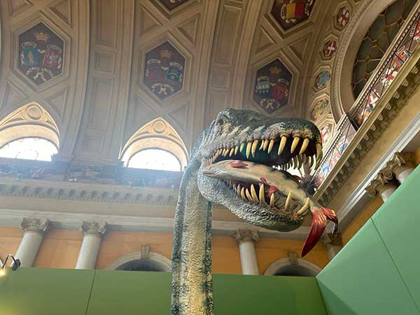 La mostra è nella sala degli Stemmi, quindi non è grandissima, sono all’incirca quattro sale. Nella prima sala troviamo erbivori e ne osserviamo le evoluzioni, alcuni sono diventati animali marini, altri volatili. Nella seconda c’è il TRex, il più amato. E si muove. nella terza sala il triceratopo  e un coloratissimo terizinosauro, o segnosauri. Proseguendo anche una vasca con la sabbia e trovare le ossa sepolte, come veri paleontologi e il selfie corner.