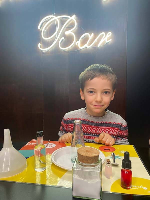 Oltre alla visita agli spazi espositivi,  i bambini possono  partecipare e laboratori e fare veri e propri esperimenti scientifici al C-lab, il laboratorio immersivo. Noi abbiamo costruito un vero vulcano e fatto scoppiare un palloncino solo con alcune piccole gocce di buccia d’arancia.