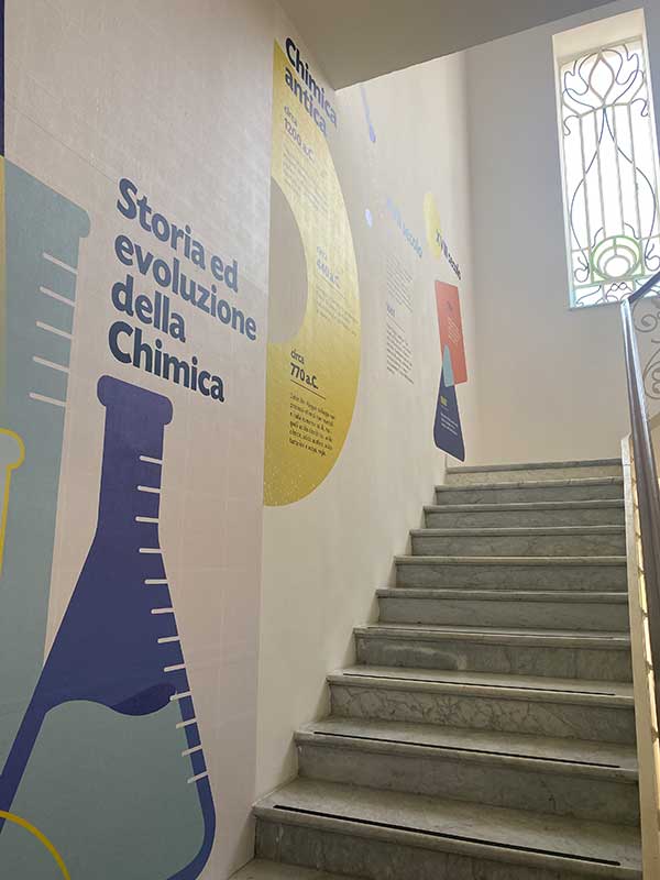 Varcata la soglia, si entra  nella storia e fa un certo effetto. Già solo le scale sono meravigliose. Architettura liberty con vetrate colorate ( e c’è anche subito un esperimento sui colori i Light-Plin, con i dischi colorati). Ogni dettaglio è super curato, con particelle ed elementi chimici riprodotti in rilievo sul soffitto o disegnati per terra.