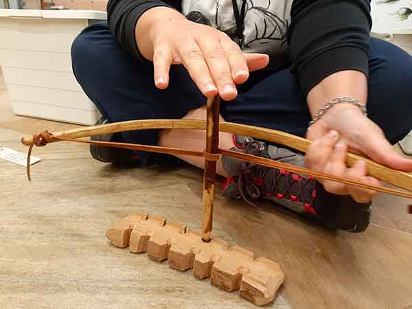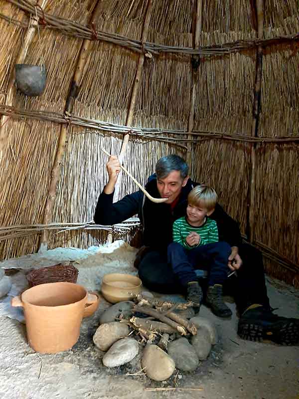 Arrivati nella Chiesa di San pancrazio veniamo accompagnati da un’altra guida alla scoperta della vita quotidiana degli uomini primitivi: grazie all’ausilio di pannelli informativi, alla riproduzione dell’interno di una capanna e alle preziose spiegazioni forniteci, supportate dal laboratorio tattile (grazie al quale si possono toccare con mano gli strumenti realizzate con pietre di zona, legni e colla di linfa di betulla) è stata possibile un’esperienza immersiva nella vita dei nostri antenati. Anche Arturo (quasi cinquenne) che non ha ancora studiato questi argomenti a scuola ne è rimasto rapito e affascinato e ha partecipato attivamente al gioco proposto.