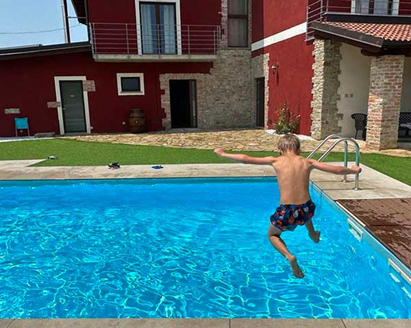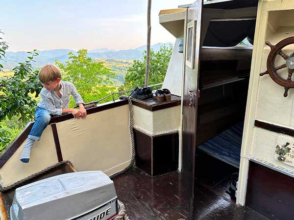 I bambini nel vederla sono letteralmente impazziti e hanno subito iniziato ad esplorarla. Una barca nel bosco, con giubbotti di salvataggio, bandiere e timone si presta a decine di giochi e la fantasia vola libera. Mentre i più piccoli si immergono in avventure di pirati, tesori e galeoni, i più grandi possono concedersi un tuffo in piscina.