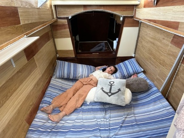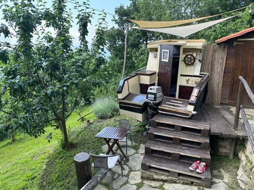 Qui a Torresina, tra alberi da frutto e più di 50 specie di piante autoctone, la Nave nel Bosco non è più solo un proverbio, ma una realtà: si tratta di un vero e proprio fuori bordo, in legno e vetroresina perfettamente funzionante ed ora adibito e ristrutturato a camera con servizi e confort. Inserita in un contesto verde di oltre 700 mq offre la possibilità di dormire in una barca in mezzo alla Natura e con vista sull’ invidiabile paesaggio dell’alta Langa. Nella barca ci sono tutti i comfort: un bel materasso matrimoniale, cuscini, lenzuola, coperte, un bollitore con tisane, un minifrigo e qualche libro. A fianco della barca Mario ha costruito un bagno completo di doccia calda, lavabo e wc. A disposizione anche un tavolino con sedie per godersi il fresco della serata e il panorama.