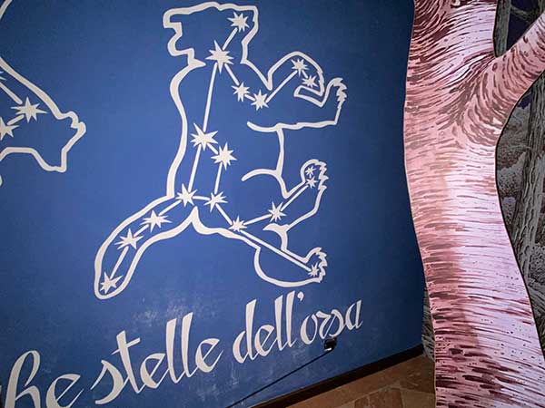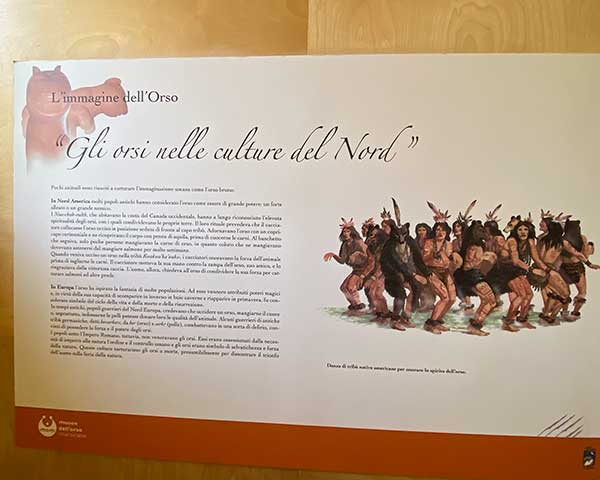 Si entra nel museo da una piccola stanza, con le luci soffuse. Bisogna stare in silenzio, perché la stanza riproduce l’ambiente del bosco di notte, con i suoni registrati dal vivo. Segue poi una prima parte dedicata all’orso nell’immaginario comune ed alla sua evoluzione durante gli anni e una sezione destinata al linguaggio e ai cartoni animati con orsi protagonisti, da Yoghi a Winnie the Pooh. Seguendo le tracce dell’orso si passa alla seconda parte, quella più scientifica, dedicata alla vita ed alle abitudini degli orsi. A chiudere questa splendida visita, c’è una grande stanza con cassetti e pannelli per giocare con gli orsi, imparando a scoprire come scovare graffi lasciati sugli alberi, cacche nei boschi e come riconoscere le impronte lasciate dai grandi mammiferi.