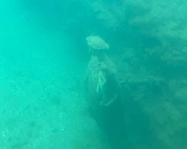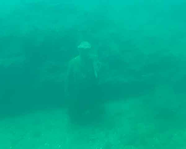 La flora e la fauna marina si sono letteralmente appropriate dei resti che riusciamo ad intravedere grazie alle indicazioni della guida: il perimetro di una stanza, un corridoio, dei gradini….e infine le statue, che più di tutte rendono l’idea che ciò che stiamo guardando sono delle vere e proprie ville sommerse.