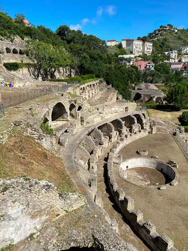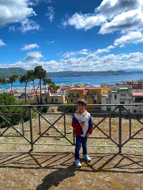 Passeggiare tra le mura di questo sito archeologico è un po’ come salire su una macchina del tempo e attraversare un tunnel spazio temporale: siamo partiti dalla Villa dell’Ambulatio, composta da 6 terrazze che si affacciano su un panorama mozzafiato. Davanti a noi, gli occhi si perdono sul Golfo di Bacoli e si posano sul Castello di Baia , visibile sulla destra in lontananza.