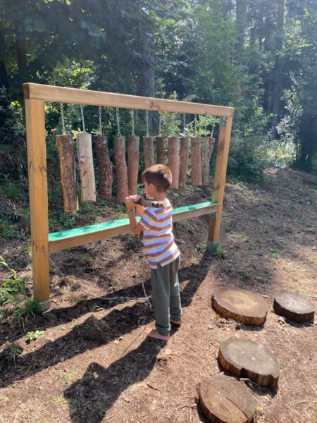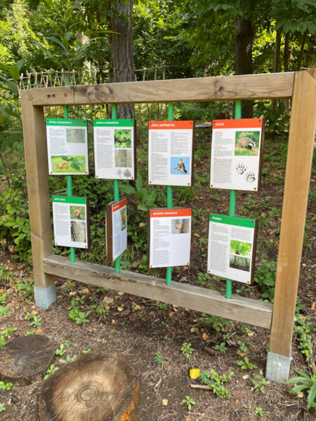 Si passa poi su tronchi sospesi e botti di legno fino ad arrivare a due installazioni: una cornice contenenti pezzi di legno che possono essere “suonati”, cosi da distinguere il tipo di legno in base al suono emesso e un’altra con alcune tavole descrittive sugli animali del bosco.