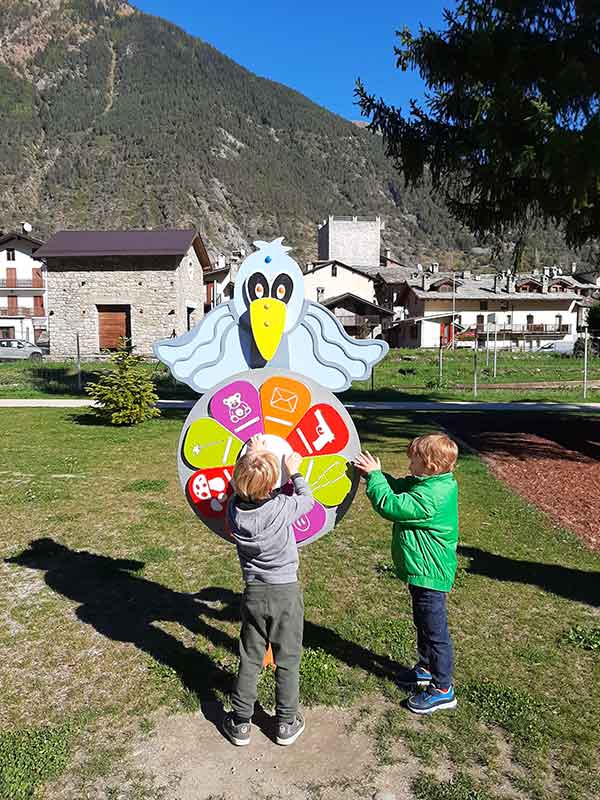 Anche Arturo, che non sa ancora leggere, ha apprezzato questo angolo di cultura incastonato tra la Dora e le montagne, si è divertito a saltare sulle caselle del grande gioco dell’oca, ha provato a percorrere il labirinto, si è chiesto chi sono i personaggi delle grandi sagome che costellano l’itinerario e, infine, ha preso un libro dalla postazione di bookcrossing (ce ne sono 40 in tutta Morgex) e si è seduto a sfogliarlo su una delle panchine illustrate con la storia di Pinocchio.