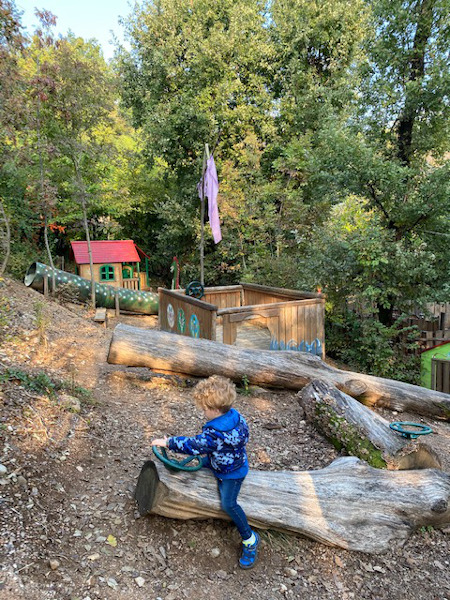 Noi, dopo aver individuato un tavolo dove sistemare le nostre cose, abbiamo accompagnato Mattia ad esplorare il parco, tra aree pic nic, casette, giochi in legno, scivoli e percorsi avventura.