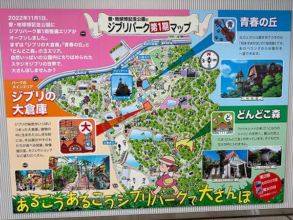 Il Ghibli Park si trova nella prefettura di Aichi, ed è stato realizzato all’interno dell’Aichi Earth Expo Memorial Park, l’ex sede dell’Expo 2005. Ci sono voluti circa due anni per realizzarlo, non è stato abbattuto nessun albero, né è stato stravolto il parco, ma sono state riqualificate zone chiuse o abbandonate, come la vecchia piscina.
