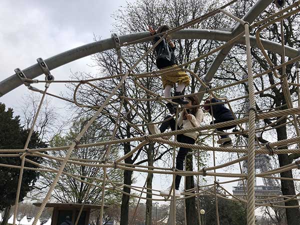 Il playground al Champ-de-Mars è ampio, spazioso, con altalene, scivoli, reti per arrampicarsi…terreno morbido e giochi in legno.