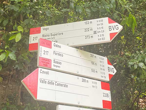 Se siete abituati a camminare e avete bimbi che camminano da soli o un marsupio, vi suggeriamo una deviazione. Noi su consiglio di un passante abbiamo preso il sentiero 217 in direzione di Gaino: 237 metri, 230 gradini (all’ombra) e mezz’ora di cammino.