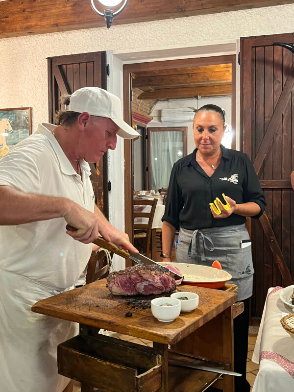 Cosa si mangia? La regina del menù è assolutamente la carne alla brace. Già leggendo il menù ci è saltata all’occhio la fiorentina Sandokan e mentre stavamo decidendo cosa ordinare è partita la musica in sottofondo e Luciano è entrato in sala con un carrello con su un bel taglio di carne pronta da gustare, che ha tagliato e condito al tavolo facendo venire l’acquolina in bocca a tutti presenti!