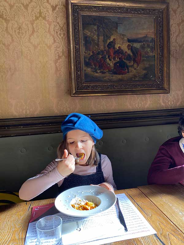Seconda accortezza: non è un buffet, ma c’è un menù fisso, quindi, grandi e bambini devono sapersi adattare. I gusti sono semplici. C’è un piatto di entrata, un antipasto, un primo, un secondo e molti dolci. Caffè lungo, the  e succhi di frutta a volontà.