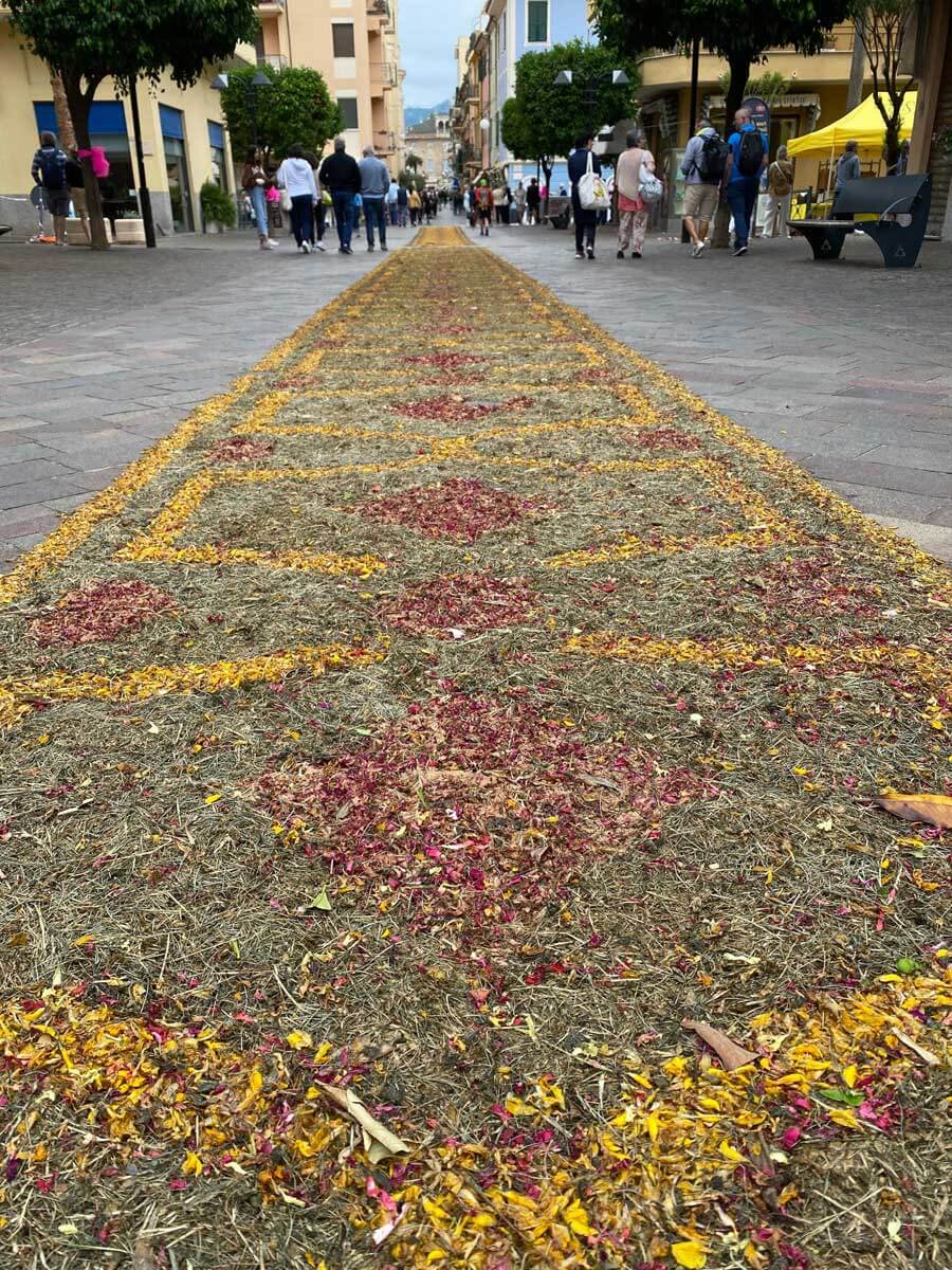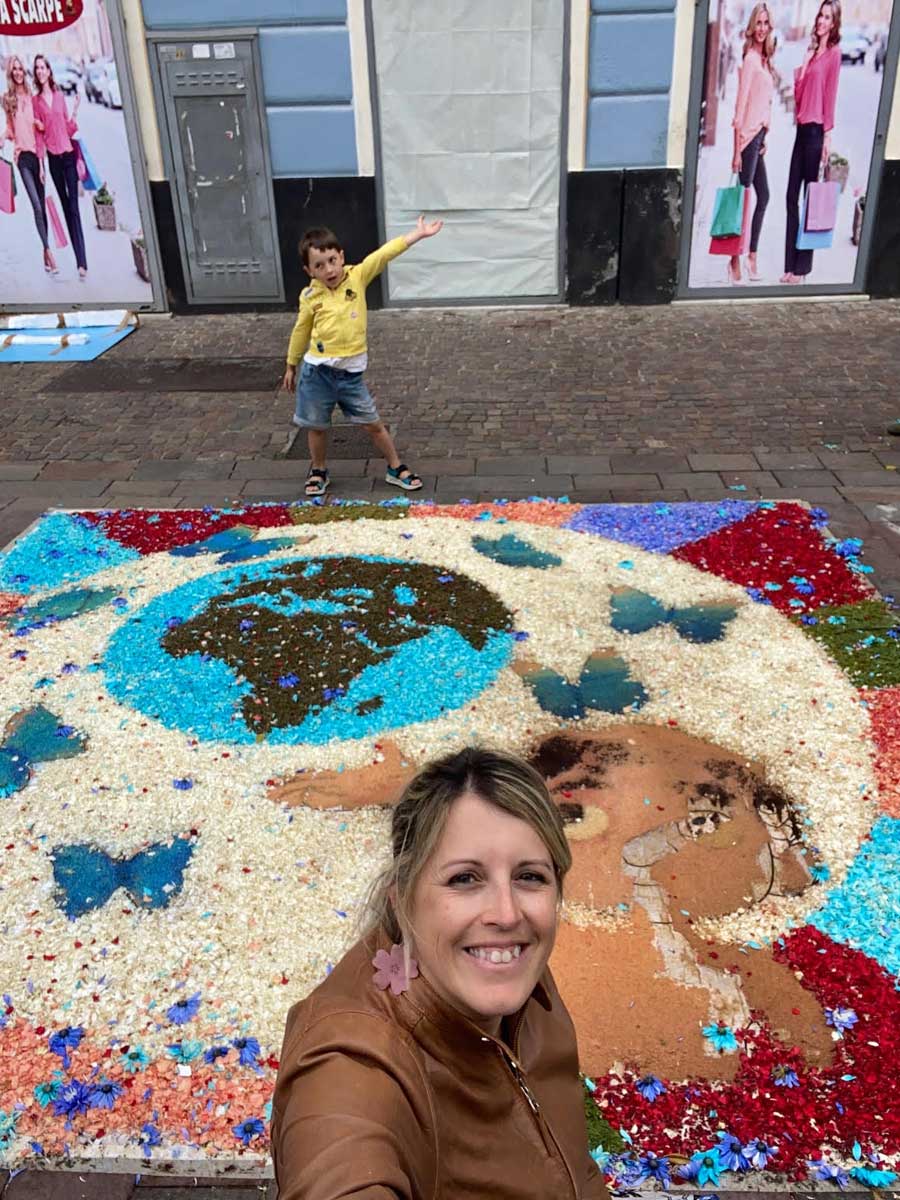Purtroppo la bellezza di queste opere è anche molto delicata e infatti a noi quest’anno è capitato di visitare l’infiorata di Pietra Ligure il secondo giorno dopo una notte di pioggia e vento che hanno distrutto totalmente alcune bellissime opere.