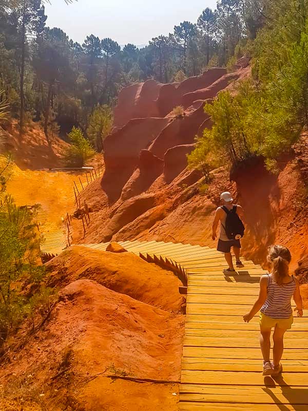 Saliti oltre le case, avvolti dall’incessante canto delle cicale, si inizia un percorso a piedi in mezzo a falesie e giacimenti d’ocra formatosi dall’erosione del vento. Questo sentiero è denominato il Sentiero delle Ocre ed è davvero spettacolare. Si è circondati da queste formazioni rocciose dalle forme più particolari e dalle sfumature che vanno dal giallo, all’arancione e al rosso che con la luce del sole si accendono ulteriormente regalando scorci stupendi.