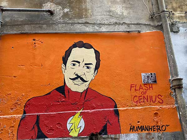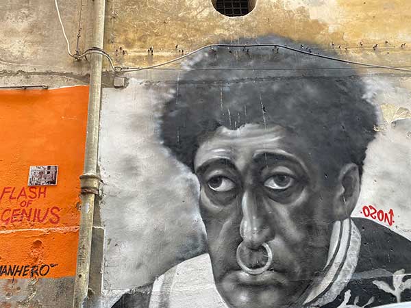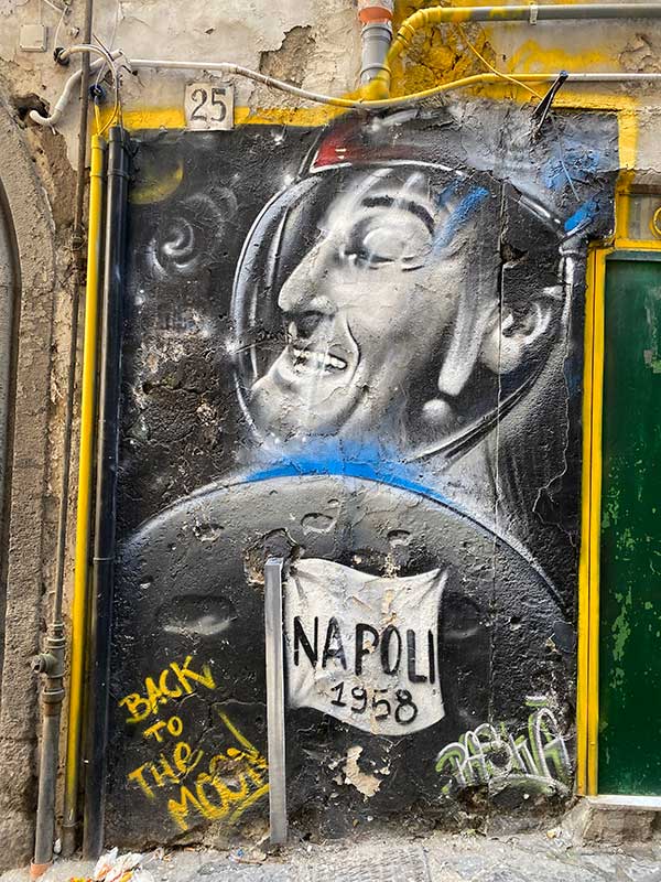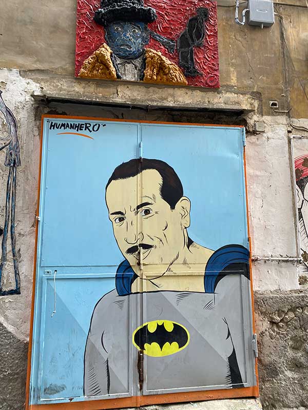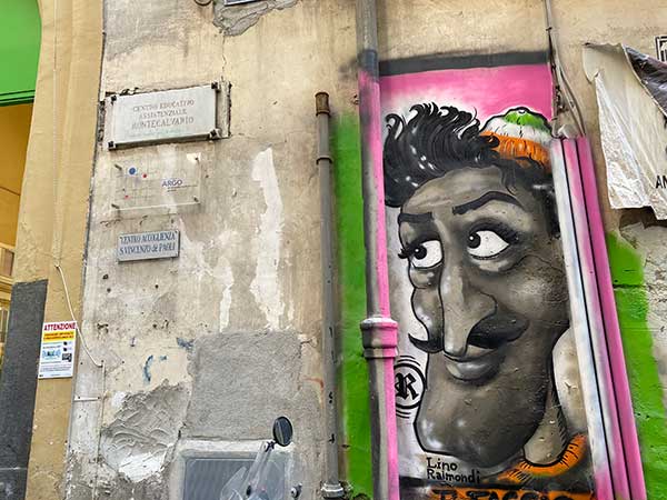 Il vicolo poi, piano piano, si è popolato di murales, manifesti e foto del principe del sorriso e di suoi colleghi come Nino Taranto, Peppino De Filippo che diventano super eroi, clown…i volti noti della tradizione napoletana si trasformano, assumono nuove forme e anche il vicolo diventa una grande, unica tela di creatività napoletana.