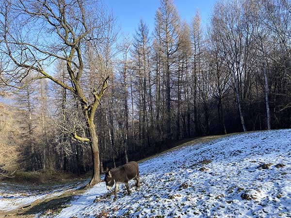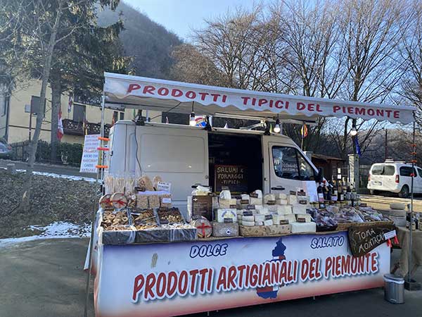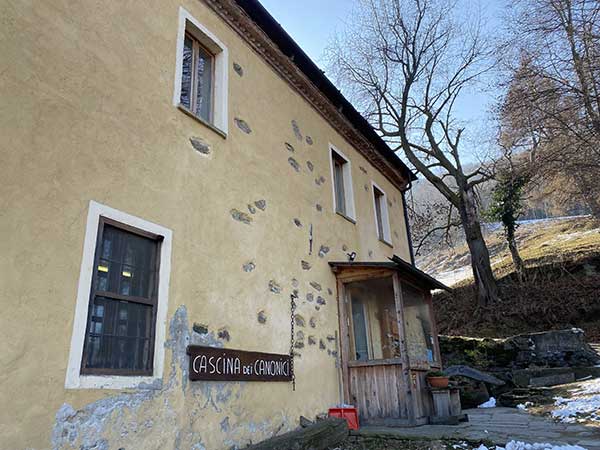 Da qui resta un ultimo tratto che è in discesa e arriva al piazzale Croce Nera, dove troviamo alcuni furgoncini che vendono formaggi e dolcetti locali. Qui la strada si biforca nuovamente: verso destra si prende la strada che in 10 minuti porta alla Sacra, verso sinistra si sale verso l’agriturismo dei Canonici dove abbiamo deciso di fare la nostra pausa pranzo.