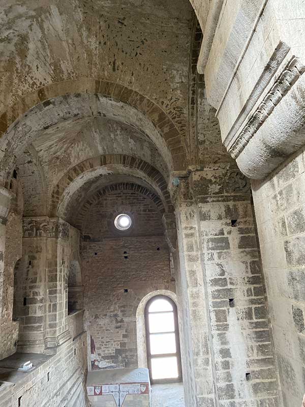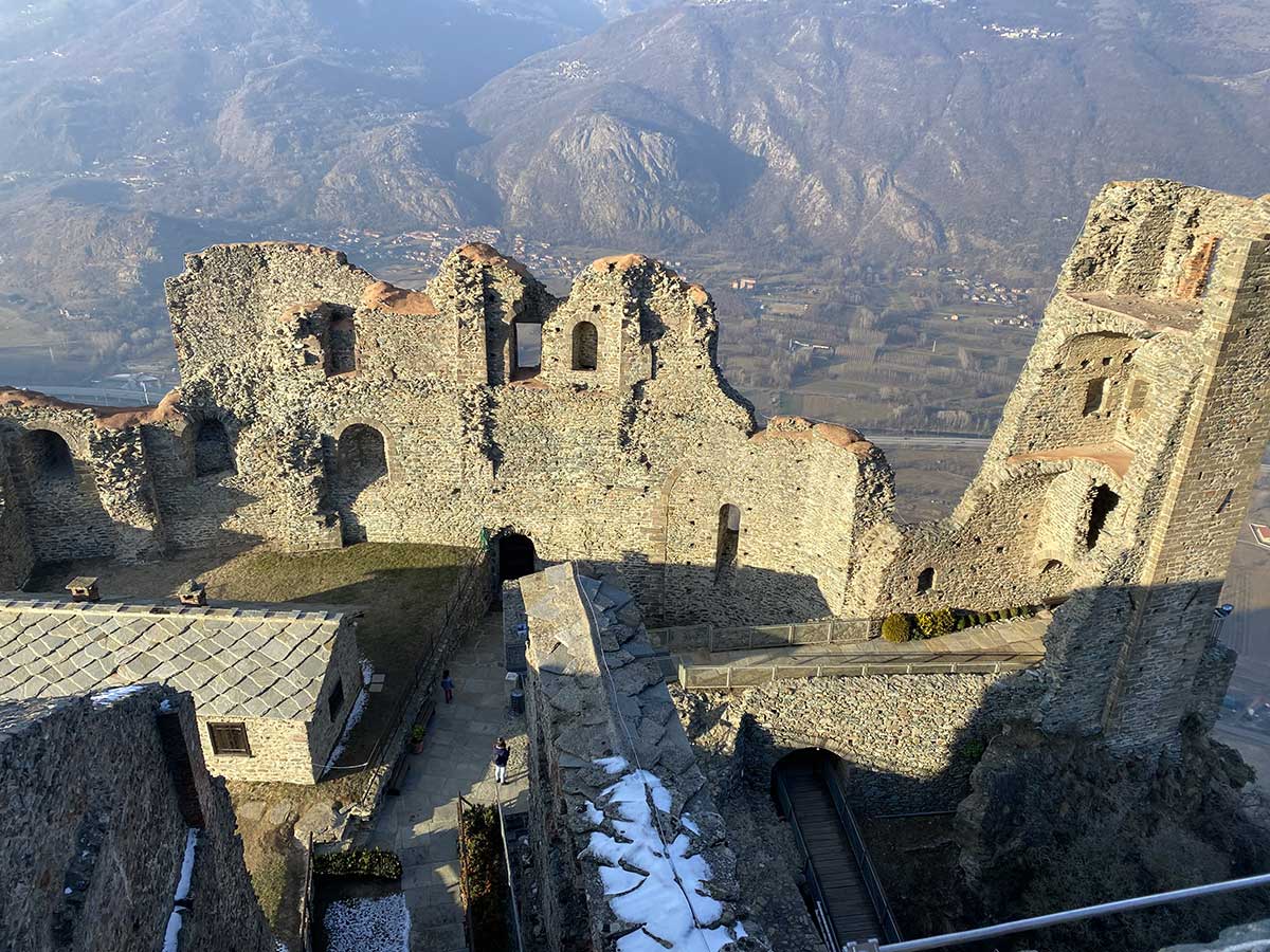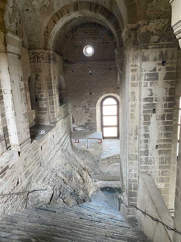 Il giro termina con l’uscita sulla terrazza più alta e meglio esposta dell’abbazia. Un vero e proprio momento WOW, un tuffo al cuore nel trovarsi sospesi su uno strapiombo da cui ammirare un panorama mozzafiato sulle montagne circostanti e sulle rovine del sepolcro dall’alto. Un brivido che vale la visita.