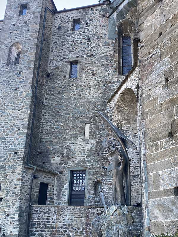 LA STATUA DI SAN MICHELE E LA LINEA MAGICA: Come dice il nome stesso, la Sacra di San Michele è un’abbazia dedicata a questo santo, la cui statua di oltre 5 metri troneggia sulle scale prima di accedere all’interno. E qui incontriamo il primo mistero, quello della cosiddetta linea magica di San Michele. Sembra infatti che una linea energetica unisca tre basiliche/abbazie dedicate proprio all’Arcangelo Michele.: il Mont Saint Michel, situato in Francia nella regione della Normandia, la Sacra di San Michele appunto e il Monte Sant’Angelo in Puglia.